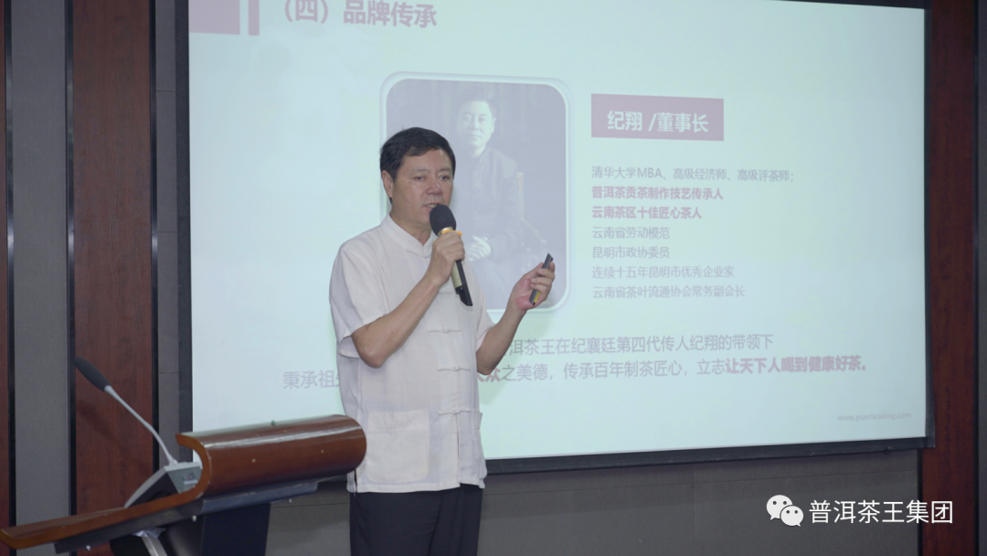 发布会现场,云南省茶叶流通协会常务副会长、“中国古代十大茶人”纪襄廷第四代传人、贡茶技艺传承人、普洱茶王公司董事长纪翔先生首先向与会嘉宾介绍了公司现状和未来发展蓝图。普洱茶王集团依托优质的产品和服务,通过城市合伙人、庄园主、茶王商城三大营销模式,立志成为中国茶行业领军品牌,以达成上市发展为近阶段目标。2021年产品体系全面升级,公司追求高品质、有形象、好服务、重细节。以品质和质量,赢得消费者和合作伙伴的信任。