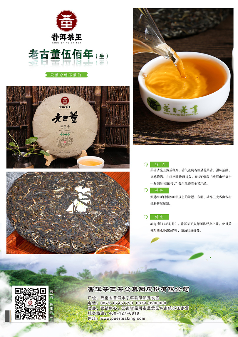 价格:3420元 年份:2014年 规格:357g/饼 (42饼/件) 类别:普洱生茶 只羡今朝不羡仙 特点:茶汤清亮且汤质稠厚,香气浓纯有明显花果香,滋味浓醇、口感饱满、生津回甘快而持久。2016年荣获“峨眉山杯第十一届国际名茶评比”普洱生茶类金奖产品。 原料:甄选2013年树龄500年以上的景迈、布朗、冰岛三大名山古树纯料拼配压制。 标准:357g/饼(28饼/件 ),普洱茶王大师团队经典之作。使用盖碗与沸水冲泡7g茶叶。